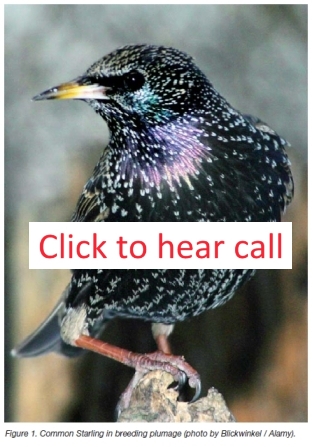 Starling (Sturnus vulgaris) are a small-medium sized bird approximately 21.5cm long and weighing around 70 - 100 grams. males and females look similar in appearance and juveniles are generally more grey/brown in colouration. The feathers or adults are iridescent green/purple and glossy. White flecks are common across the body, head and wings. The wings are black. Beak is blackish in colour,except duyring breeding when it is yellow.